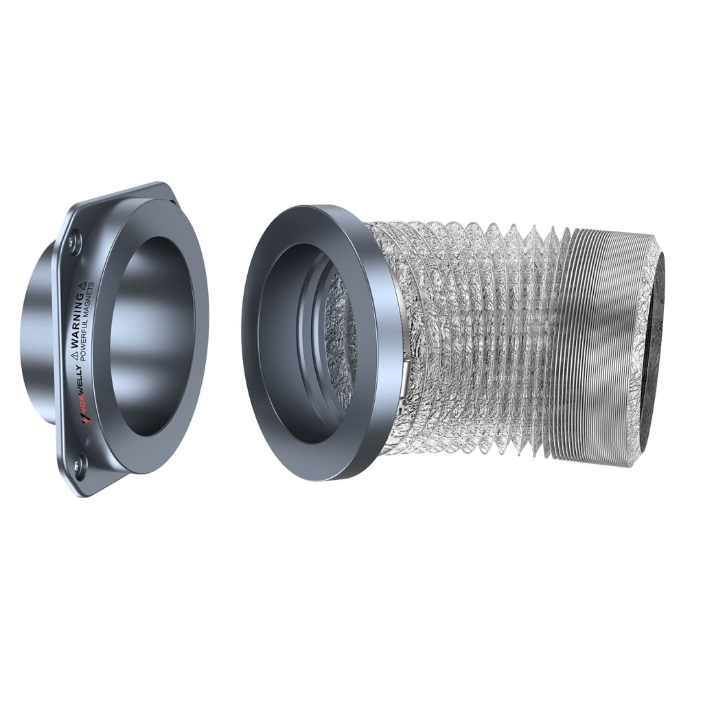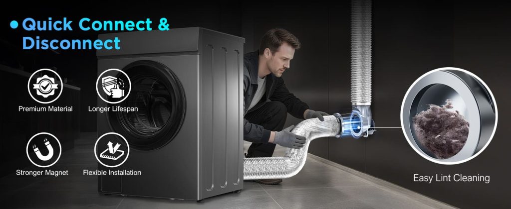 Magnetic Connection: The dryer vent coupling consists of two parts—one attaches to the dryer’s exhaust outlet, and the other to the duct vent leading outside. These parts are equipped with strong magnets, which allow them to connect easily without requiring screws, clamps, or other fasteners.